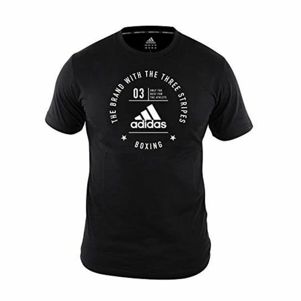 Adidas Boxing “THE BRAND WITH THREE STRIPES” T-Shirt – Made from 100% cotton with adidas boxing neck taping. The brand with the three stripes and large adidas logo printed large on the front of this garment.