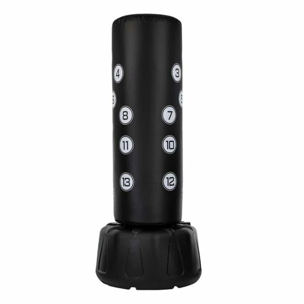 Designed for commercial grade use to stand up to consistent, heavy strikes from hard hitting martial artists. High density foam padding for maximum impact absorption. The tapered base features an ergonomic design allowing for an unimpeded stance for athletes of all sizes. The rubber sealed fill cap keeps water where it belongs, but is easy to access to top off the weight. The innovative new locking mechanism securely locks the bag to the base allowing for the hardest strikes, day in and day out.