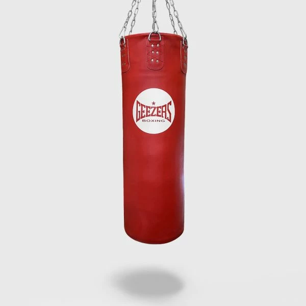 Geezers Elite Pro Impact Leather Heavy Punch Bag – Made using the finest quality leather the punch bag has a full impact foam liner and is perfectly weighted using the best filling materials. The foam lining is designed to protect the boxer’s hands when punching, plus offering the ultimate feel on impact. Featuring precision stud and stitch work, this bag should not sag or misshape. A D-ring on the bottom of the bag can be used to anchor the punch bag to the floor, preventing excessive swinging. The bag is complete with red detailing on the top and bottom of the bag. Hanging chains not included.