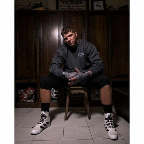 TITLE Boxing Muhammad Ali Pocket Crew Sweatshirt – V-Patch front & half-moon back with room for embellishment. Twill taped neckline. Front pouch pocket with headset opening. Spandex reinforced rib knit cuffs & waistband.